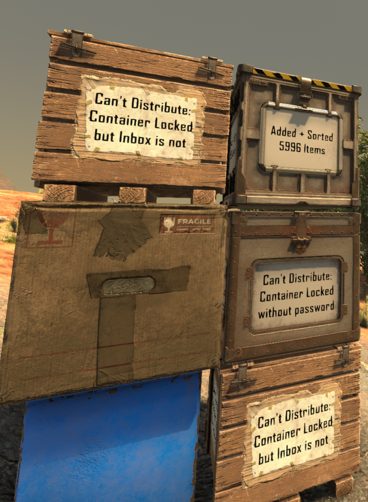 - Container organization is run on each box within range via a concurrent loop. This ensures that as inboxes are scanning and updating your players’ containers, the server can still process other tasks and avoid zombie or crafting lag.